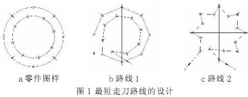 加工圖 1 中 a 圖所示為零件上的孔系。b 圖的走刀路線為先加工完外圈孔后, 再加工內圈孔。 若改用 c 圖的走刀路線, 減少空刀時間, 則可節省定位時間近 1 倍, 從而提高了加工效率。
