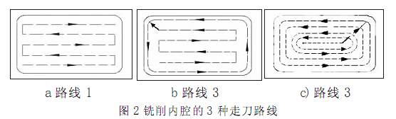 為保證工件輪廓表面加工后的粗糙度要求輪廓應安排在最后一次走刀中連續加工出來。 見圖 2 中 a 圖所示為用行切方式加工內腔的走刀路線, 這種走刀方法能切除內腔中的全部余量, 不留死角, 不傷輪廓。但行切法將在兩次走刀的起點和終點間留下殘留高度而達不到表面要求的粗糙度。所以如采用圖 2 中 b 圖的走刀路線, 先用行切法, 最后沿周向環切一刀, 光整輪廓表面,能獲得較好的效果。圖 c 也是一種較好的走刀路線方式。