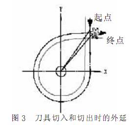 考慮刀具的進、 退刀 ( 切入、 切出) 路線時, 刀具的切出或切入點應在沿零件輪廓的切線上, 以保證工件輪廓光滑; 應避免在工件輪廓面上垂直上、 下刀而劃傷工件表面; 盡量減少在輪廓加工切削過程中的暫停 ( 切削力突然變化會造成彈性變形) , 以免留下刀痕見圖 3。