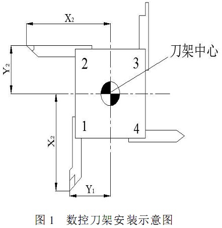 刀具位置尺寸補償的實質是將刀具相對于工件的坐標由刀具安裝的定位點移到刀尖位置。以最簡單的四工位數控車床旋轉刀架為例,由圖1可以看出,刀具1 相對與刀架中心的坐標為 X1 、Y1 ,刀具2相對于刀架中心的位置為X2 、Y2 ,因為數控車床刀具安裝系統的特性,即便是尺寸完全相同的兩把刀具安裝在同一臺數控機床的旋轉刀架上,其相對于刀架中心的尺寸也不可能完全相同,所以需要通過對刀操作以補償因為不同刀具相對于刀架尺寸不同而在換刀時出現的刀尖不重合的現象,簡言之,就是要通過車刀位置尺寸補償來使不同尺寸的車刀在同一個工件坐標系的坐標中運動。數控車床對刀設置的方法一般有試切對刀、機械對刀儀對刀( 接觸式)、光學對刀儀對刀( 非接觸式) 等。