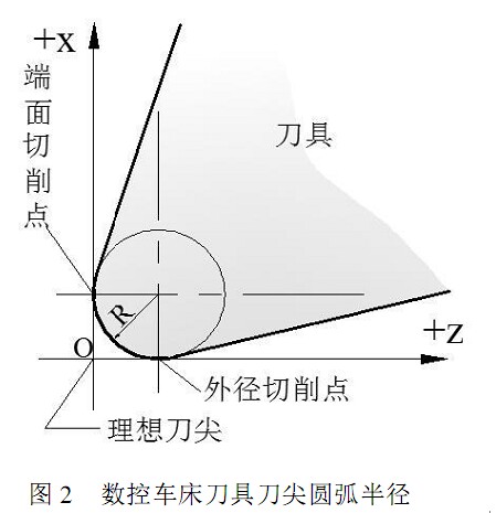 通過上面的刀具位置尺寸補償,我們已將數控編程的坐標點設置在了刀具刀尖點上。但為了提高刀具的使用壽命和降低加工工件的表面粗糙度,通常將刀尖磨成半徑不大的圓弧,一般圓弧半徑尺寸在0 . 4 ~ 1. 6 mm 之間,如圖 2 所示。很顯然,假想刀尖點與實際切削點是不同點,當加工與坐標軸平行的圓柱面和端面輪廓時,刀尖圓弧并不影響其尺寸和形狀。但當加工錐面、圓弧等非坐標方向輪廓時,刀尖圓弧將引起其尺寸和形狀誤差,而且刀尖圓弧半徑越大,誤差越大。這種誤差的大小不僅與輪廓形狀、走勢有關。而且與刀尖圓弧半徑有關,當零件加工精度要求較高時,就可能出現超差,所以如果在數控加工或數控編程時不對刀尖圓角半徑進行補償,僅按照工件輪廓編制的程序來加工,勢必會產生加工誤差[ 1]。