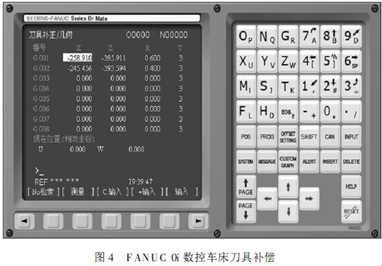 在FAN UC 的數控編程中,用 T 功能選擇刀具并調用刀具補償,其格式為 T xx x x ,其中前兩個 xx為刀具號,后兩個 x x 為刀具補償號,如 T0202。如果刀具補償號為00 , 則 表 示 取 消 刀 補。 按 下OFFSE T SE TTING 后在 CRT 上顯示刀具補正界面,按下補正對應的功能軟件后在CRT 上將顯示磨耗和形狀兩個選項,如圖4 所示,其中一般將對刀結果存儲在形狀存儲器中,而磨耗存儲器中一般用于輸入切削余量和修正對刀結果以及由于刀具磨損形成的零件加工誤差。磨耗和形狀均對應刀具位置補償( X 和 Z 值) 和刀具圓弧半徑補償( R 和 T 值) 共 4 個參數。在加工之前,將對刀結果和相應的磨耗補償輸人到對應的存儲器CRT 上顯示。在自動執行過程中,數控系統按該存儲器中的 X 、 Z 、R 、T 的數值,自動修正刀具的位置誤差和自動進行刀尖圓弧半徑補償[ 2]。