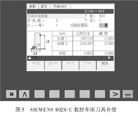 在SIEMENS 數控系統中,使用 Txx 調用刀具,其刀具補償號由 Dx x 指令指定,其后的數字表示刀具偏置存儲器號。例如 T01 D01 ,如圖5所示,對應刀具位置補償中,長度 1 就是X 軸方向的補償,長度2 就是Z 軸方向的補償,刀具圓弧半徑補償值 R 填在半徑存儲器里。與 FANUC系統相同,其中一般將對刀結果存儲在長度對應的幾何尺寸中,而長度對應的損存儲器一般用于輸入切削余量和修正對刀結果以及由于刀具磨損形成的零件加工誤差。在自動執行過程中,數控系統調用該存儲器中的長度1 、長度2 、半徑的幾何尺寸和磨損值疊加的數值,自動修正刀具的位置誤差和自動進行刀尖圓弧半徑補償[ 3 ]。