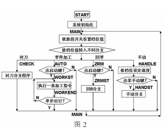 由圖 可見(jiàn)有零件加工 手動(dòng) 回零 對(duì)刀等四個(gè)功能程序段 另外還有三段中斷服務(wù)程序 控制加工速度的定時(shí)器 中斷服務(wù)程序 實(shí)現(xiàn)暫停功能的外部中斷 中斷服務(wù)程序 實(shí)現(xiàn)入群的通信程序 串行口中斷服務(wù)程序