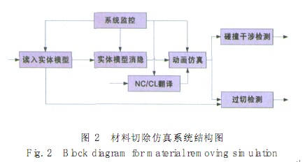 對于材料切除過程仿真, 國內(nèi)外也有一些研究成果, 主要集中在相應(yīng)的算法方面。 如基于 Z- map 結(jié)構(gòu)的算法[11]、 基于 Dexel 模型的快速成型算法[12], 等等。總的來說, 材料切除過程的仿真主要有兩個(gè)功能: 一是檢測是否過切、 干涉、 碰撞, 以檢測 NC代碼和刀位文件的正確性; 二是通過逼真的三維動畫來實(shí)現(xiàn)可視化仿真, 為虛擬制造提供支撐環(huán)境。圖 2 為一個(gè)典型的材料切除仿真子系統(tǒng)的功能結(jié)構(gòu)圖。