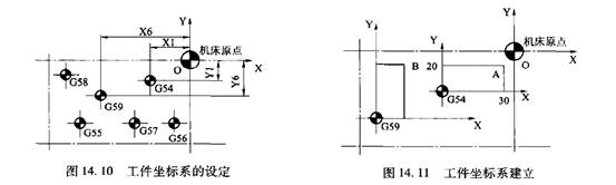 例如,用G54和G59建立兩個(gè)坐標(biāo)系,首先測(cè)量出對(duì)應(yīng)工件原點(diǎn)與機(jī)床原點(diǎn)的偏置量,即G54 (X1, Y1, Z1)、G59 (X6 , Y6 , Z6 ),然后在相應(yīng)的工件坐標(biāo)系選擇畫面上填入相應(yīng)值,就完成了G54 , G59工件坐標(biāo)系的設(shè)定。此后程序中有G90 G54 X30 Y20時(shí),則向預(yù)先設(shè)定的工件坐標(biāo)系中的A點(diǎn)移動(dòng),如圖14. 11所示。