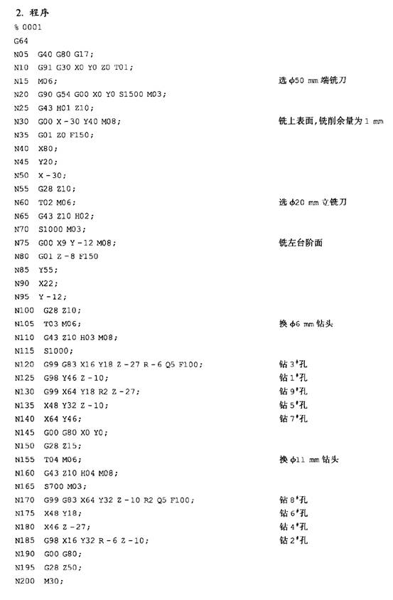 由于零件較小,外形規(guī)則,采用平口鉗裝夾即可,選擇以下四種工具進(jìn)行加工:1號(hào)刀為Φ50 mm端銑刀,用于銑上表面;2號(hào)刀為Φ20 mm立銑刀,用于銑左臺(tái)階面;3號(hào)刀為Φ6 mm鉆頭,4號(hào)刀為Φ11 mm鉆頭,用于孔加工。通過(guò)測(cè)量刀具,設(shè)定補(bǔ)償值,用于刀具補(bǔ)償。該零件的工藝規(guī)程見(jiàn)表14. 3 –