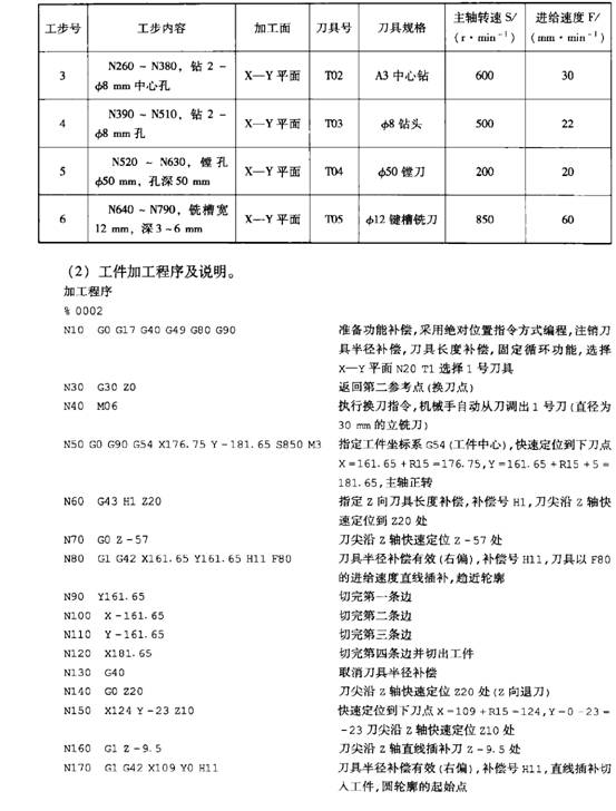 (1)刀具半徑補(bǔ)償G40,以1,以2。加工中心的刀具半徑補(bǔ)償與數(shù)控銑床刀具半徑補(bǔ)償類似,一般是指銑刀中心軌跡與工件的實(shí)際尺寸之間的距離采用半徑補(bǔ)償方式來(lái)設(shè)定,補(bǔ)償量為刀具半徑值。第13章已經(jīng)介紹過(guò),在使用半徑補(bǔ)償時(shí),編程按工件實(shí)際尺寸來(lái)計(jì)一算,而加工中刀具軌跡可自動(dòng)偏置。詳細(xì)內(nèi)容見(jiàn)第13章