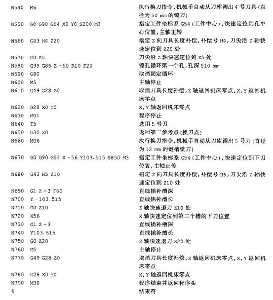 換刀指令由G,r M06構(gòu)成。T為選刀指令,一般為T00一T99, T00為刀具庫(kù)中的空刀位,不安裝刀具。一般在加工程序結(jié)束前,要把主軸上的刀送回刀具庫(kù)中,執(zhí)行T00 M06即可。T01一T99為1一99號(hào)刀具位置。如果說(shuō)要用3號(hào)刀,那么T03的功能就是把刀具庫(kù)中的3號(hào)刀位上的刀轉(zhuǎn)至待取位置。M06為換刀指令,當(dāng)執(zhí)行M06時(shí),自動(dòng)換刀裝置把待取位置上的刀與主軸上的刀同時(shí)取下并相互交換位置。一般選刀和換刀分開(kāi)執(zhí)行,選刀動(dòng)作可與機(jī)床加工同時(shí)進(jìn)行,即利用切削時(shí)間選好刀具;而換刀必須在主軸停轉(zhuǎn)條件下進(jìn)行,因此換刀動(dòng)作指令M06必須編在用“新刀”進(jìn)行加工的程序段之前,等換上“新刀”,啟動(dòng)主軸后,方可進(jìn)行下面程序段的加工。
