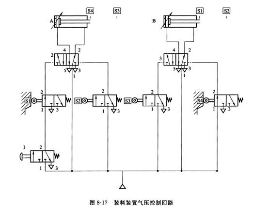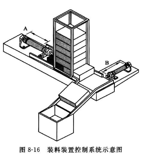 用兩個氣缸從垂直料倉中取料并向滑槽傳遞工件,完成裝料的過程。如圖8-16所示,要求按下按鈕缸A伸出,將工件從料倉推出至缸B的前面,缸B再伸出將其推人輸送滑槽。缸B活塞伸出將工件推入裝料箱后,缸A活塞退回,退到位后,缸B活塞再退回,完成一次工件傳遞過程。