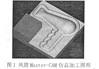 MasterCAM 軟件是基于微機平臺最經濟、 最有效的CAD/CAM 集成軟件, 側重于數控加工, 在零件加工和模具制造中應用非常廣泛.MasterCAM 具有很強的數控自動編程能力, 應用軟件本身內嵌的后置處理器可實現簡單及復雜模型的自動編程, 針對不同的數控系統不同的加工模塊 ( 如車削、 銑削、 線切割等)都具有相對應的后置處理文件[ 4 ].MasterCAM 銑削模塊系統缺省的后處理文件為MPFAN. PS T , 適用于FANUC 系統數控代碼的控制器.在利用KXK7250 加工中心 ( 數控系統為北京KND100M)進行實際加工時,也應該選擇相應的后處理程序, 用缺省的后處理程序時, 輸出的NC 文件不能直接用于加工.所以需要對MPFAN. PS T 文件進行修改, 使之適合于KXK7250 加工中心的后置處理程序.圖1 為風筒模型Master-CAM軟件仿真加工圖形