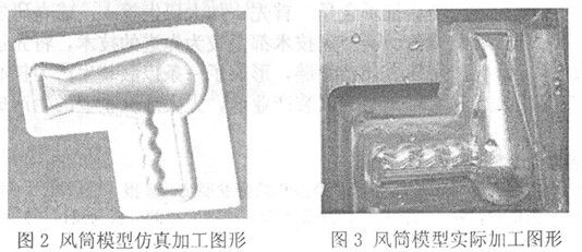 經過仿真軟件的加工可以簡單地驗證加工圖形的輪廓、 形狀, 但對于精度及表面質量等要求還不能保證, 所以必須經實際機床加工才能進一步證實代碼的正確性.利用微機 DNC 功能將專用后處理器生成的數控程序輸入到數控機床 KXK7250 , 實際加工出的零件滿足要求.圖 3為風筒模型實際加工圖形.
