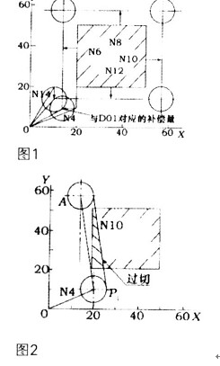 原因是當從N4段進入刀補啟動階段后,只能讀入N6、N8兩段,但由于Z軸是非刀補平面而且讀不到N10以后的段,也就作不出矢量,確定不了進刀的方向。此時盡管用G41進入了刀補狀態(tài),但刀具中心卻并未加上刀補,而直接移動到了點P1,當P1執(zhí)行完N6、N8段后,再執(zhí)行N10段,刀具中心從P1移動到交點A,此時就產生了圖2所示的進刀超程(過切)工件被切掉一塊。
