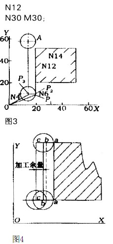 方法三:利用刀補指令使粗、精加工程序簡化。如圖4所示,可有意識地改變刀具半徑補償量,因為刀具半徑補償指令是按照刀庫表中的刀具半徑值而確定補償量的大小的,而不管實際用的刀具的半徑值的大小。那么,在應用時則可用同一把刀具、同一條程序、不同的切削余量完成加工。從圖4可以看出,當設定補償量為a c時,刀具中心按cc運動,第二次設定補償量為ab時刀具中心按bb運動完成切削。這樣就可以通過改變刀庫表的刀具半徑的參數(shù),來完成多次切削而不用重新編寫程序。對加工不同材料的工件可以用同一條程序選用不同的加工余量進行精加工。其編程方法和以上相同。